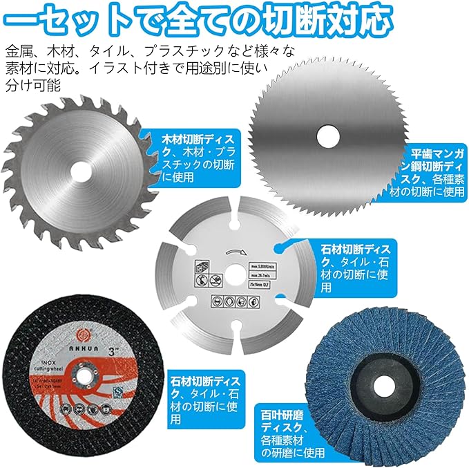【コストパフォーマンス】:5枚の異なるタイプの刃がセットに。金属切断、木工切削、石材加工、研磨まで、これ一本で必要な作業を網羅。