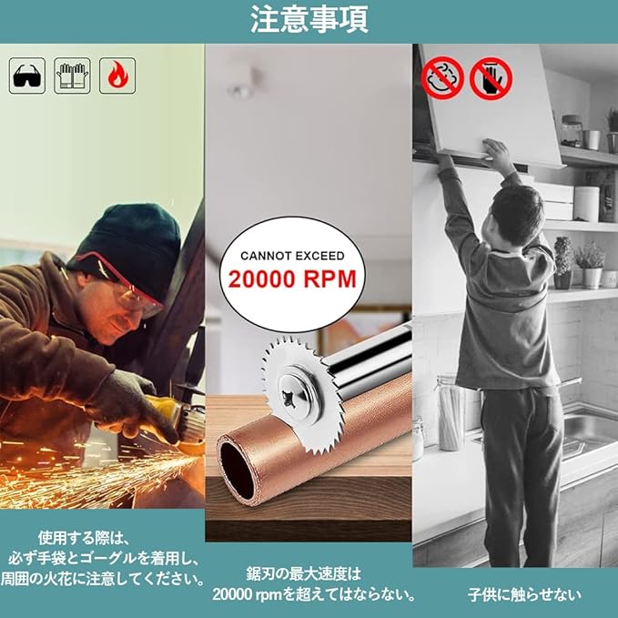 【注意事項】1.使用する際は、必ず手袋とゴーグルを着用し、周囲の火花に注意してください。2.このスリッターブレードを使う時は回転速度が遅くなって、ロッドを最後まで持たねばなりません。鋸刃の最大速度は20000 rpmを超えてはならない。