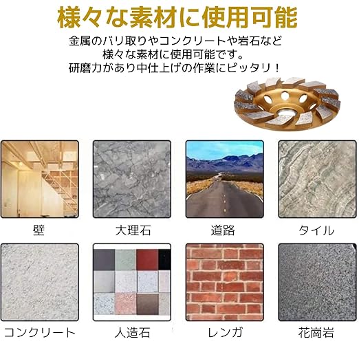 サイズ:直径約10cm 素材:炭素鋼、ダイヤモンド 仕様:大理石、タイル、コンクリート、岩石の研削 カラー:ゴールド ※モニターの環境等により、色の見え方に若干差が生じる場合がございます。