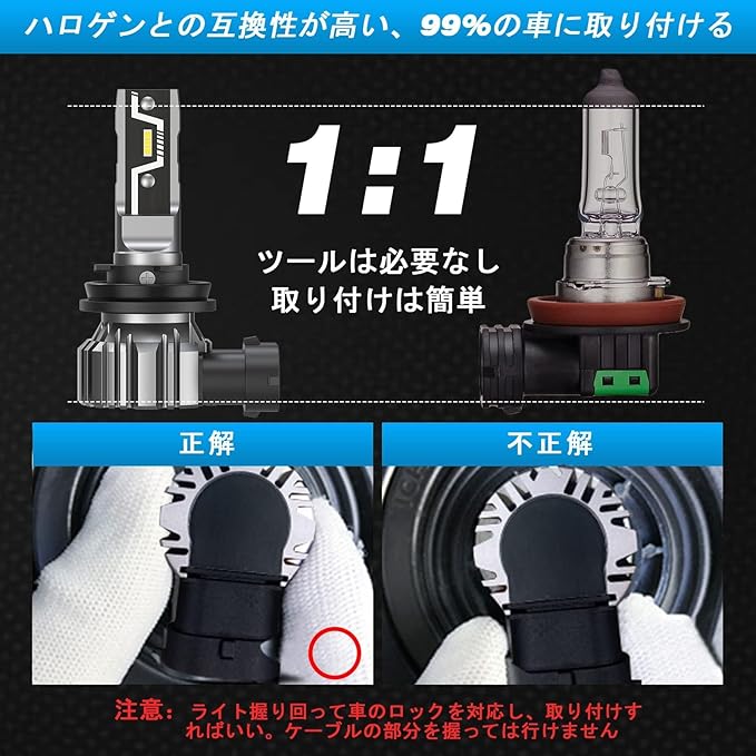 【取付簡単・干渉防止性能】h11 ledヘッドライトはコントローラーを内蔵した一体型LEDヘッドライトバルブ設計で、制品サイズは非常にコンパクトで、取り付けも超簡単、初心者でも簡単です。超省スペースのインストール!構造を変える必要はなく、純粋に純正バルブを交換すればよい。ノイズキャンセラー内蔵、電磁干渉を防ぐ!車内のラジオで騒音や干渉もなく、安心して運転できます。(DC9V-32V車対応)