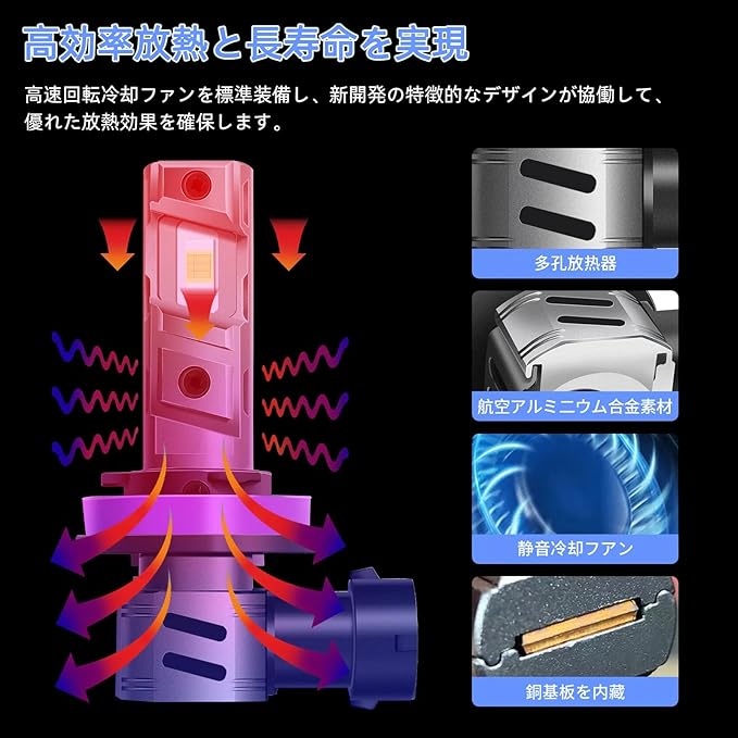 【三重放熱 50000時間長寿命】 h11ヘッドライト バルブは、一体成型の航空級アルミニウム合金ボディに、高速冷却ファンと高熱伝導銅基板を組み合わせた三重放熱システムを採用。LEDチップの発生熱を効率的に排出し、高温環境下での光衰えを抑制し、長寿命と安定した性能を保証します。