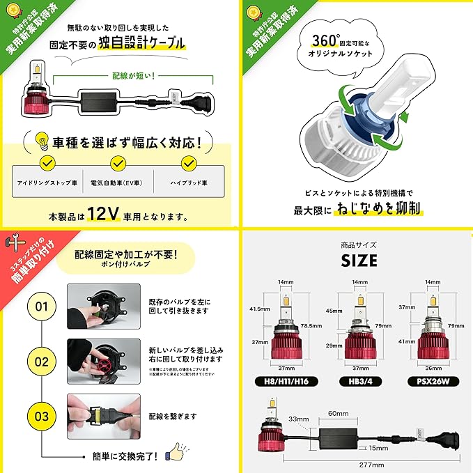 【H8/H11/H16 適合車種一例】 (一部車両は別途ユニットが必要となります。) RAV4 , C-HR 前期 , NV200 , NX350H アクア , アルファード 30系 , インプレッサ , ヴォクシー VOXY 80系 ヴィッツ vits , ヴェゼル , エスティマ , エクストレイル オデッセイ , カローラ , キックス , クラウン シビック , ジムニー , シエンタ , ステップワゴン , セレナ ソリオ , デリカD2 , デリカD5 CV5W 2W , トール ノア 80系 , ノート , ハリアー , ハスラー , フリード , フィット プリウス 30系 , ライズ , ランドクルーザー プラド , ムーヴ ライフ , ルーミー , ロッキー , ワゴンR ■PSX26W 適合車種 ハイエース 200系 4型 5型 6型 ※仕様等により形状が異なる場合がございます。必ず現車にてご確認下さい。 ※イエローにHB3形状はございません。イエロー発光のHB3/HB4をご選択いただきました場合、HB4でのお届けとなります。 ※60系ハリアー後期(H29.6~R2.5)、210系 クラウン(H24.12~H30.5)については電子制御のため消費電力の違いを検知すると警告灯が表示されたり、点灯しなくなる場合がございます。必ず電源強化リレーハーネスの装着をお願いいたします。