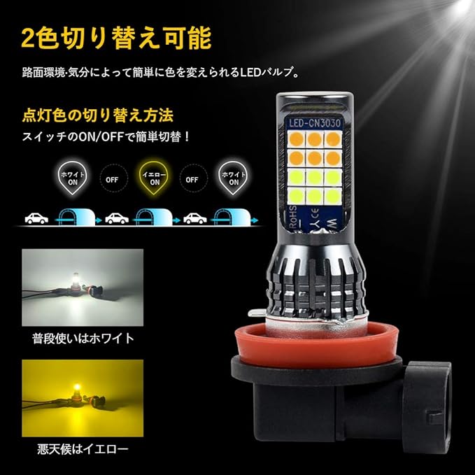 【2色発光!スイッチのON/OFFで簡単切替!】路面環境 気分によって簡単に色を変えられるLEDバルブ。一つのバルブに2種のLEDチップを採用し、新開発の切り替え制御機能を融合し、発光色を変更したい場合バルブを交換する必要がなく、フォグランプのスイッチをON->OFF->ON続けて操作して色を変更します。ライトスイッチでON ホワイト6000K→OFF→ONイエロー3000K→OFF→ONホワイト6000K。