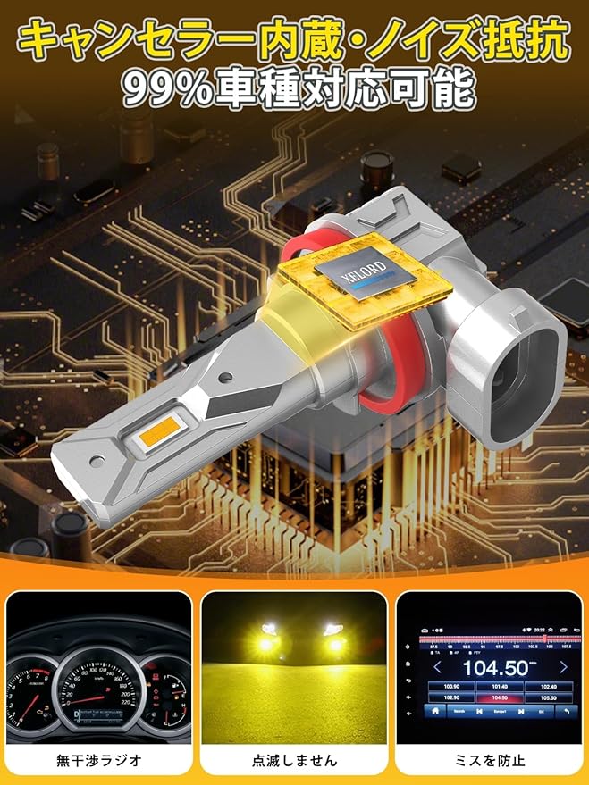 【優れた防護性能・干渉なし】日本車専用キャンセラー内蔵でラジオやナビへの干渉ゼロ。エンジン始動時や走行中でも、FMラジオの受信状態が安定し、ノイズフリーな快適ドライブを実現。本製品はIP68等級の防水・防塵性能を備えており、雨天や雪の日でも明るさをしっかりと維持します。■ 商品仕様■H11LEDフォグランプ・高効率CSPチップ採用・DC 12V車用・色温度:3000K(イエロー光)