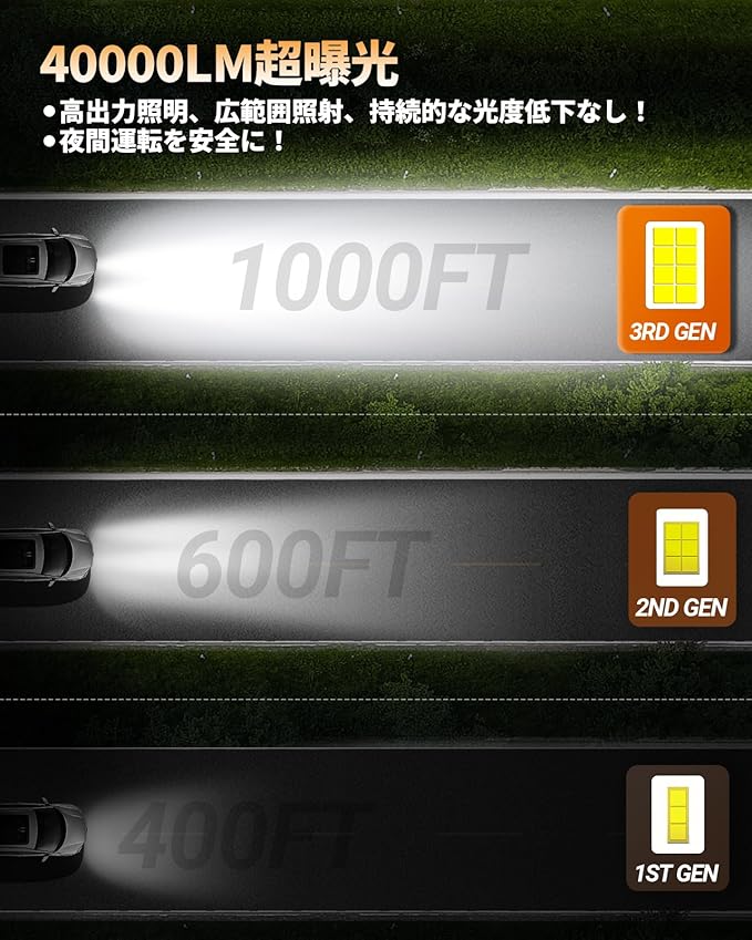 【安全運転 | 高輝度30000lm】: 車のLEDライトをアップグレードし、LEDチップの数を12個から32個(16*2)に増やしました。 これにより、30000lmの高輝度を実現し、明るく広範囲に照らすことができます。夜間や悪天候下でも、明瞭な視界を確保し、安全なドライビングをサポートします。 さらに、光の照射距離は最大300メートルに達し、遠くの障害物や道路状況を正確に把握することができます。安心して長距離ドライブを楽しむことができます。このLEDライトで、安全で快適なドライビング体験をお届けします。