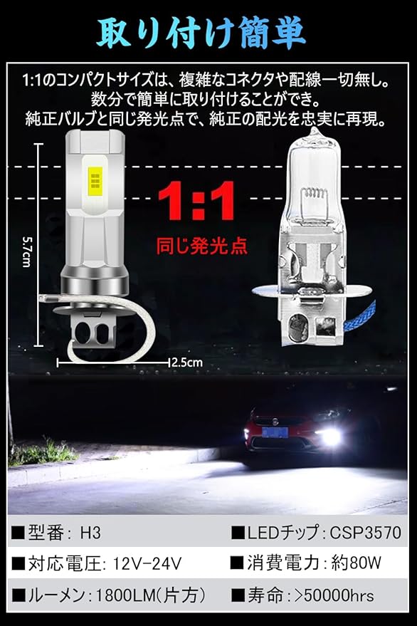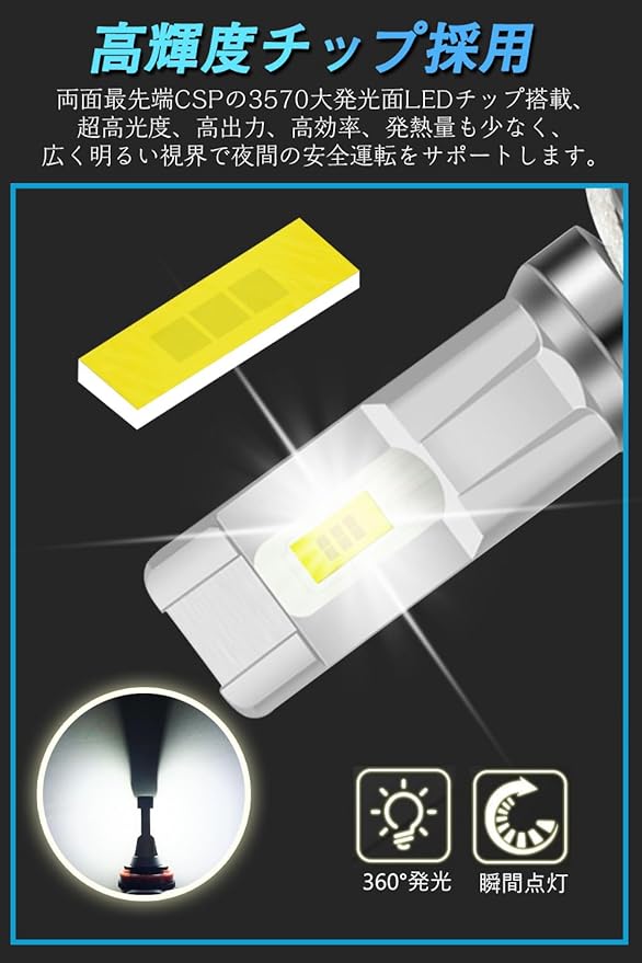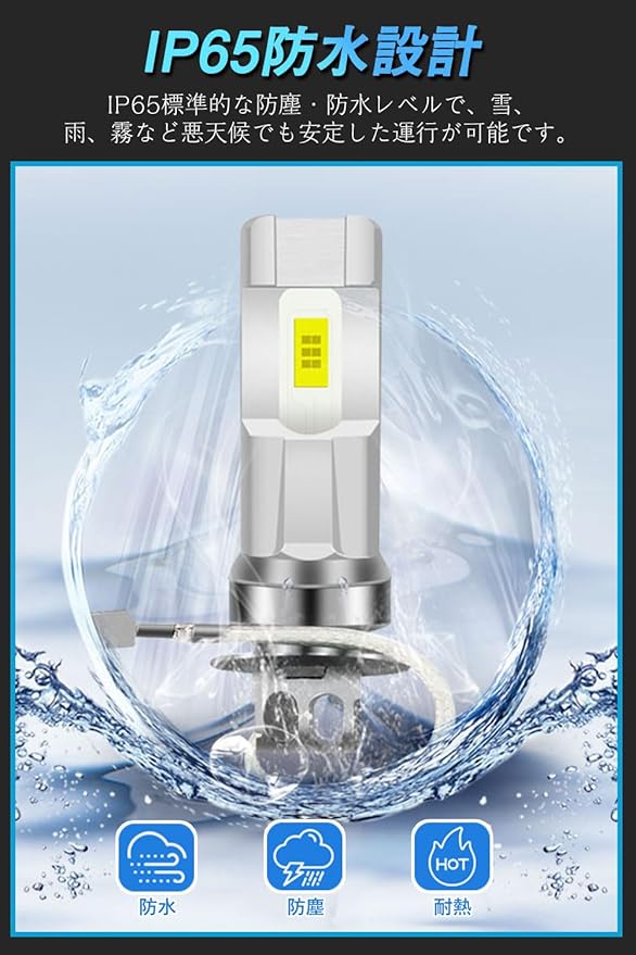 超高発光効率CSPチップ:この h3 led は高品質 3570 LEDチップ採用、発光効率が大部アップ!両面チップ搭載、均一で、高効率の発光を持って、明るさと安定性を大幅に向上させることで、視認性の高い、通常のハロゲンバルブより大きな贯通力を持つ、雨や霧、雪などの悪天候にしても良い視野を提供します。