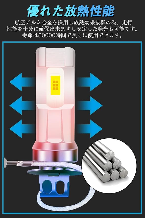 強力な放熱効果&耐久性抜群:この h3 led フォグランプ は航空用アルミ合金材質を採用、放熱効果が抜群で、LED素子の耐久性もアップでき、50000時間以上使用できます。長時間点灯しても耐えられ、安定した発光が可能です。雨の中でも安全に運転出来ます。
