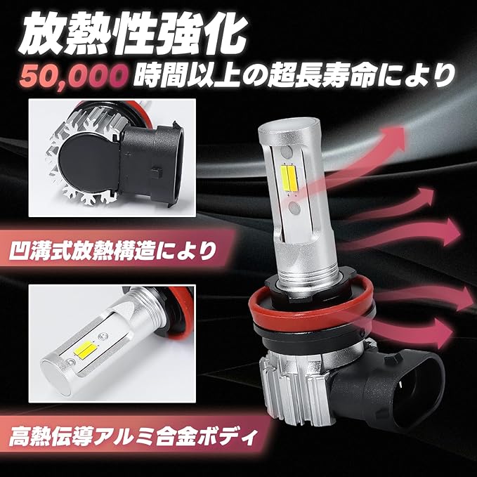 【長寿命設計&放熱性強化】高熱伝導アルミ合金ボディと凹溝式放熱構造により、連続点灯時の熱を効率的に排出。1860CSPチップ搭載で点灯不良を防止し、約50,000時間の寿命を実現。