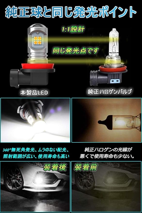 超高輝度 全方位照射:このh11 ledフォグランプ超高発光効率の3030SMD LED素子12連搭載。上部は4連、周りは8連、拡散レンズ付きで光線を集中でき、照射距離を増やせる、本気の360 全方位照射でき。市販のハロゲンより省エネルギーの上で、明るさは大幅にアップ!