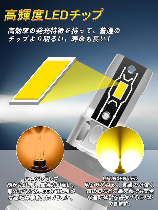 【視認性の高いイエロー光】H11 LED フォグランプ色温度3000kイエロー、従来の純正ハロゲンランプよりも貫通力が強く、雨や霧の中でも見やすくなっています!純正バルブと比較して、最大で約3倍の明るさUPが可能になります。光量不足で夜間の運転に不安を感じている人にはもってこいだ。(ご注意:フォグランプしか使えません、ヘッドライトには使えないでください。)