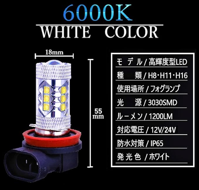 【商品規格】 ●タイプ : H8H11H16・HB3 LEDバルブ 2個 ●色温度:3500K(イエロー) ●ルーメン:2400LM ●LED数量:3030LED素子16個/1バルブ ●視野角:360 ●対応電圧:12V-30V ●消費電力:70W ●使用寿命:50000時間 ●車検対応