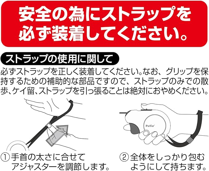 〈ブレーキ&ロックの方〉①リードの伸縮を止めたい時はトリガーを指で引いてください。ブレーキをする際は、トリガーをしっかりと引いてください。ブレーキがスベった状態(カラカラと異音がする状態)で使用すると、破損の原因となります。②トリガーを引いた状態でロックを前にスライドさせると、リードの長さが完全に固定されます。固定を解除する場合はロックを後ろにスライドさせてください。※リードがもつれた時は、全て出しきってから巻き取ってください。