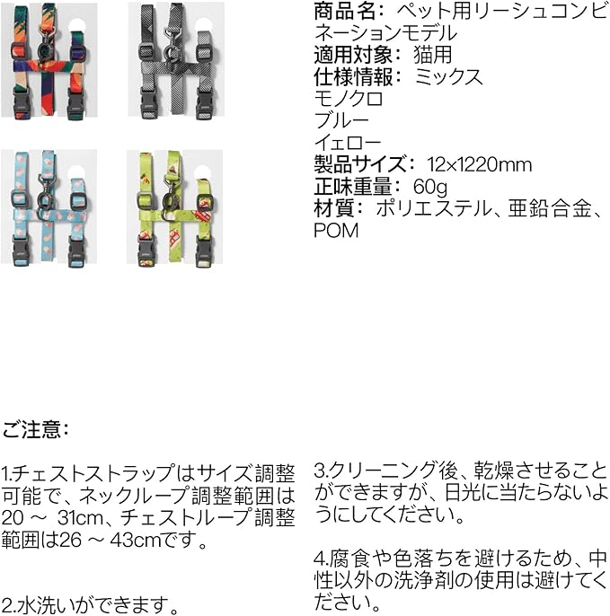 [サイズ]:ハーネス:頸部 約20~30cm、胸部 約25.5~42cm、リード(紐部分):長さ 約120cm / 幅 約1.2cm