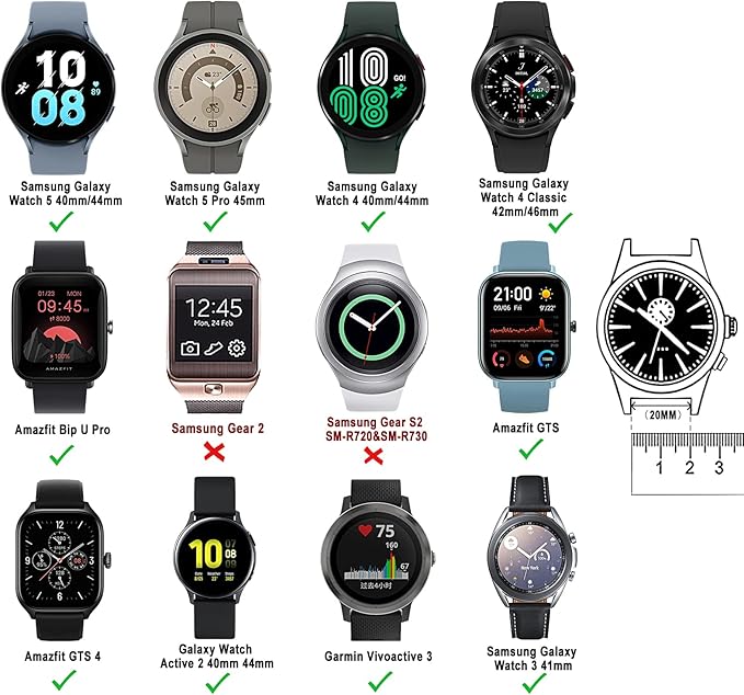 互換性:20mmコンパチブルサムスンギャラクシーウォッチ5 40mm 44mm/5 Pro 45mm/4 40mm 44mm/4 クラシック 42mm 46mm/アクティブ 2/アクティブ/ギャラクシーウォッチ 3 41mm