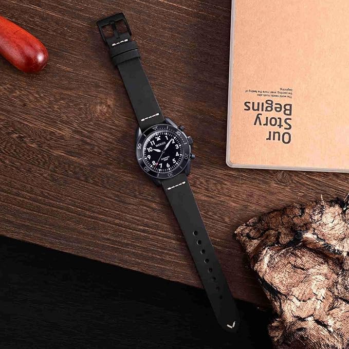 ステッチはすべてフレンチワックス糸を使用し、手作業で縫製されています。時計バンドの耐久性を高めながらヴィンテージな外観を与え、パイロットウォッチやスポーツウォッチに最適です。