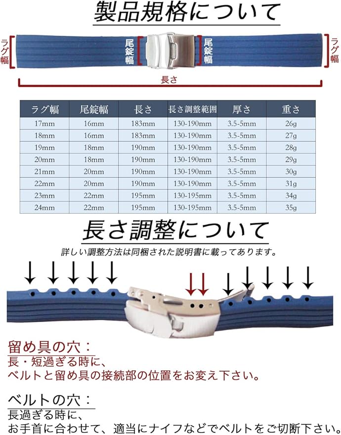 【長さ調整】二種の方法があります。①留め具部には約6mmほどの微調整ができます。②要らない部分のベルトをハサミでご慎重に切ってから、留め具に入れ戻してください。(具体的のやり方は付属した説明書には載せてあります。)