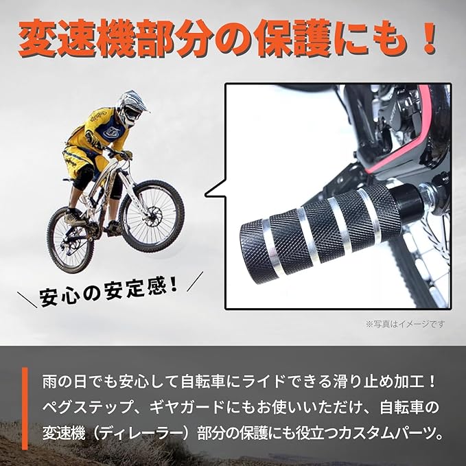 この自転車ハブステップは、4本セットとなっています。bmxペグ、自転車 ステップ、ギヤガードにもお使いいただけ、自転車の変速機(ディレーラー)部分の保護にも役立つカスタムパーツです
