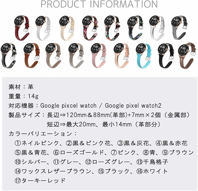 Google Pixel Watch / Pixel Watch2の新たな魅力を引き立てる、エレガントな細めの本革バンドが登場しました。この女性向けの交換用バンドは、女性らしさと快適さを絶妙に融合させ、おしゃれなアクセサリーとして活躍します。 花柄や無地のデザインが、女性らしさとスタイルを一層際立たせます。これらのバンドは、あなたの個性を引き立て、どんなファッションにも調和します。 この本革バンドは、耐久性と上質さを両立しており、日常の着用に耐えるだけでなく、肌に優しいしっとりとした触り心地を提供します。革特有の風合いを楽しむことができます。 バンドの長さはピンバックルを使用して簡単に調節でき、個別のフィット感を実現し、快適さを向上させます。 あなたのGoogle Pixel Watchをより一層魅力的に変身させましょう。この交換用バンドは魅力的なデザインと快適さを兼ね備え、あなたのスタイルに新たな魅力をプラスします。バンドを交換するだけで、腕元が一層美しくなり、あなたの個性が際立ちます。お気に入りの花柄や無地のデザインを選んで、自分らしいスタイルを演出しましょう。