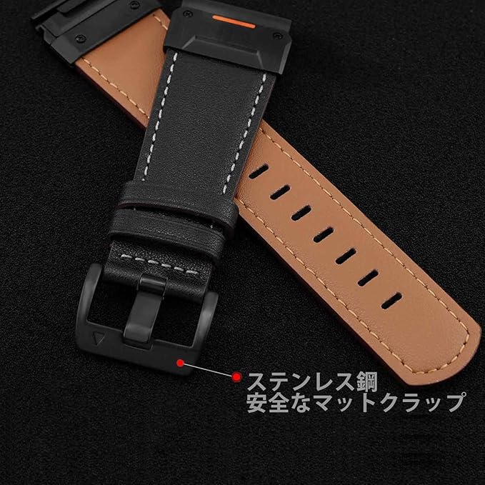 ▲ビジネススタイルと本革の質感, クラシックでレトロなデザインはGarmin Fenix 7/6/5シリーズと相性が良く、エレガントな仕上がりです。職場やフォーマルな場面にも適しています。高品質な本革は肌に優しく、通気性に優れ、快適な装着感を実現します。