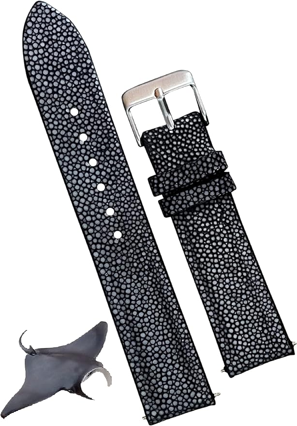[vietnamcreations] 18mm ブラック エイ皮時計ベルトスティングレイ 腕時計 バンド ガルーシャベルト 交換用時計バンド 腕首バックル付き手作りメンズ 黒 DH-60-18MM