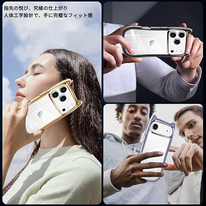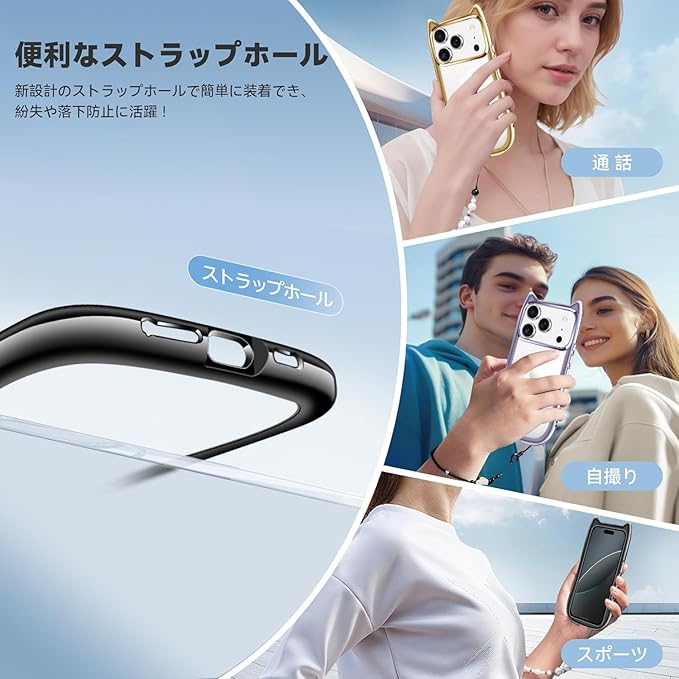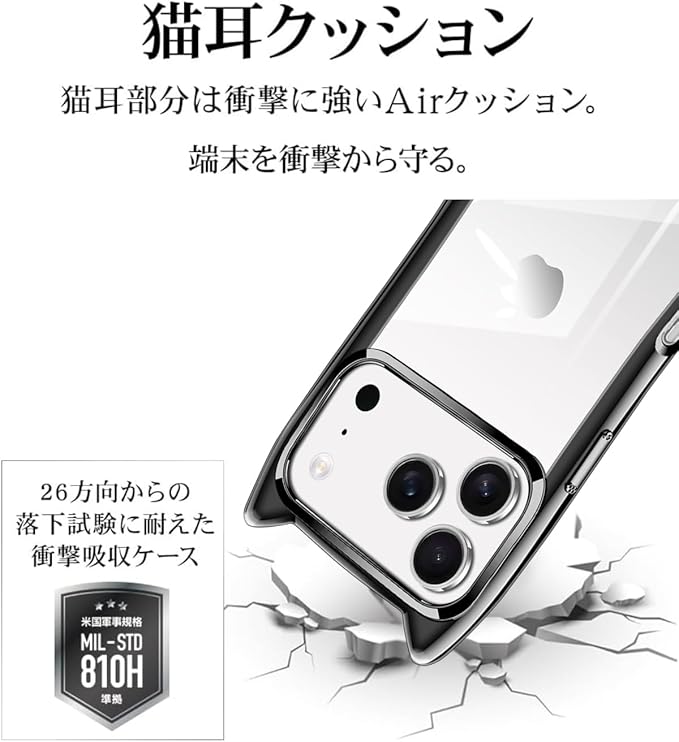 iPhone 17 Pro Max 専用 ケース クリア カバー TPU 可愛い 猫耳 ネコミミ かわいい おしゃれ ストラップホール アイフォン17プロマックス スマホケース 多機能 全面保護 落下防止(メッキブラック)