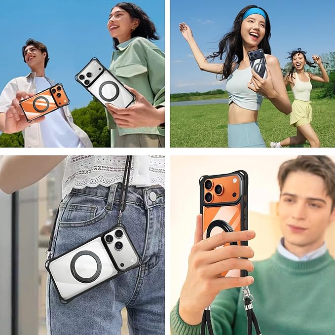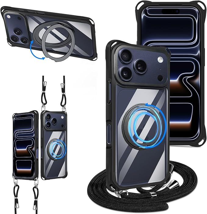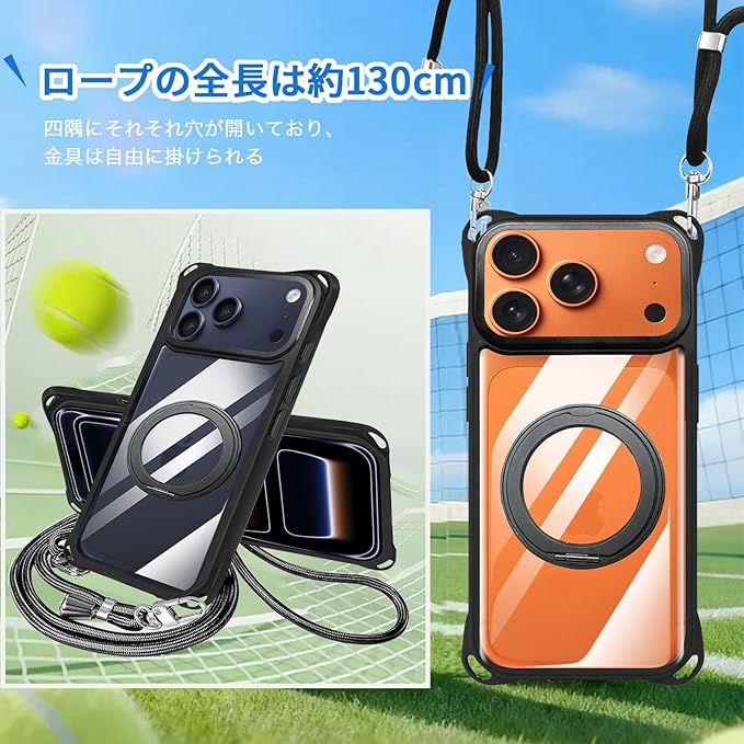 iPhone 17 Pro Max 用の ケース Magsafe対応 ワイヤレス充電 ショルダー クリア リング付き いphone 17 Pro Max 用の 肩掛け 斜めがけ 付き 縦/横 調節可能なショルダー トーラスホルダ スタンド機能 アイフォン 17 Pro Max 用の 360 回転 スマホケース ブラック