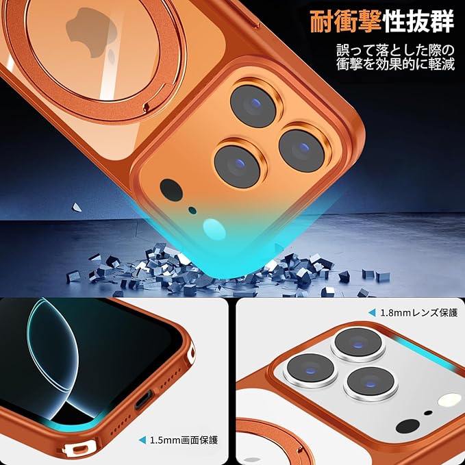 For iPhone 17 Pro Max 用 ケース ショルダー クリア リング付き 透明 MagSafe対応 マグセーフ ワイヤレス充電 スタンド機能 マグネット搭載 スマホケース アイフォン 17 プロマックス ケース シリコン TPU 調節可能 ストラップホール付き 肩がけ 首掛け 紐付き 耐衝撃 全面保護 カバー (オレンジ)