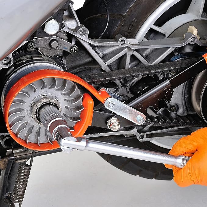 【用途】ホンダ・ヤマハ・スズキ系スクーターのプーリーやクラッチアウターを脱着する際、空回りを防止するための特殊工具です。
