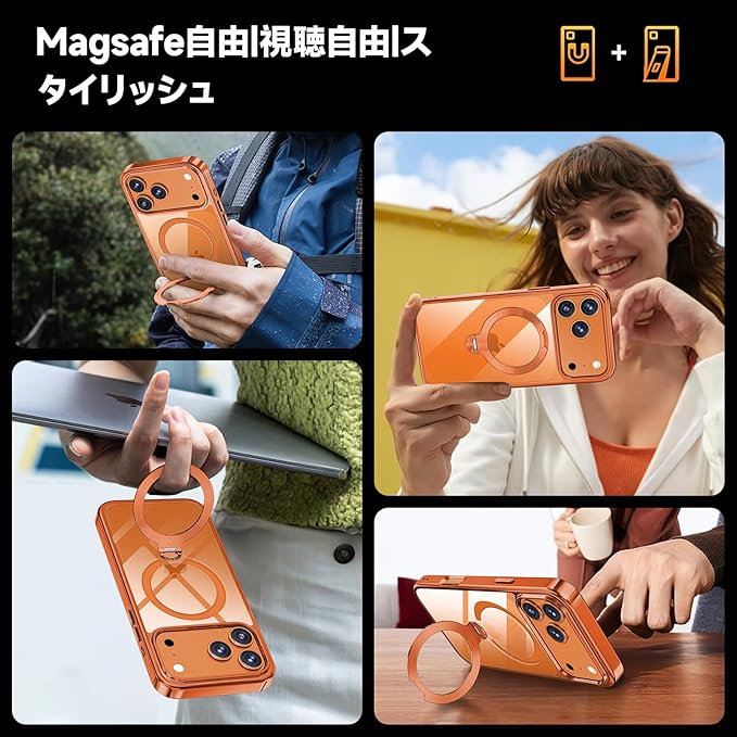 【三重保護セット!コズミックオレンジ限定】OYR iPhone 17 Pro Max用クリア ケース Magsafe 対応[360 回転CD スタンド・10 万回開閉テスト][メッキバンパー・iPhone専属色][カメラ保護とガラスフィルム付き]ストラップホール付き マグセーフ アイホン17プロマックスケース マホケース17 Pro Max 人気 米軍MIL規格・耐衝撃(6.9インチ・オレンジ)