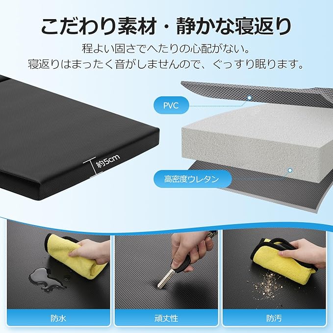 3.【こだわり素材・静かな寝返り】表面は優れた耐水性・耐酸性・耐アルカリ性・耐溶剤性を持つPVC素材を採用、汚れてもサッと拭くだけ!長時間使用しても破れにくく、劣化しにくいです。中身は硬質の高密度ウレタンを採用、程よい固さがあり、へたりの心配はありません。また、寝返りはまったく音がしませんので、ぐっすり眠ります。