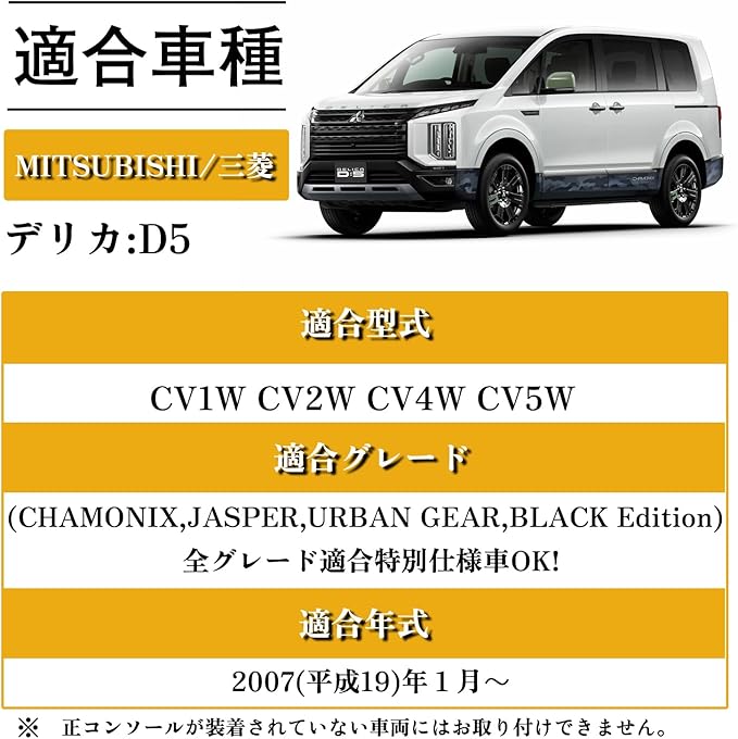 【三菱デリカD:5専用設計|シート間にぴったり装着】 本製品はデリカD:5のシート形状に基づき設計された専用コンソールボックスです。工具不要で簡単に設置でき、運転席と助手席の隙間を有効活用し、車内空間をさらに便利にカスタマイズします。