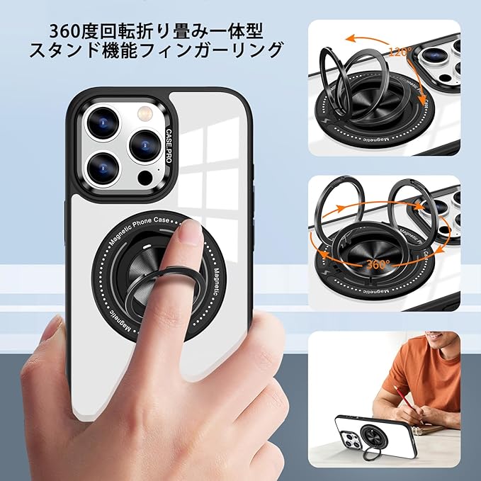 【スタンド機能 スマホリング一体型】 360度回転する一体型スマホリングが取り付けられております。 スマホ操作時に指にリングを通していただければ落下防止に役立ちます。 また、120度角度調整が可能でスタンド機能として動画視聴にも便利です。