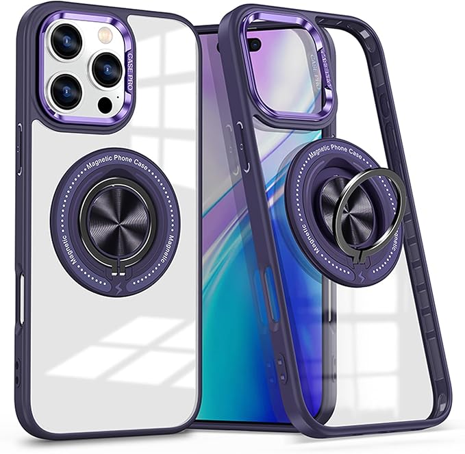 iPhone 15 Pro Max 用 ケース 背面リング スタンド機能 クリアケース カメラ枠メタリック TPU クリアPC 耐衝撃 薄型 軽量 アイフォン15プロマックス カバー ストラップホール iPhone15ProMax 車載ホルダー Magsafeアクセサリー対応 (iPhone 15 Pro Max, パープル)