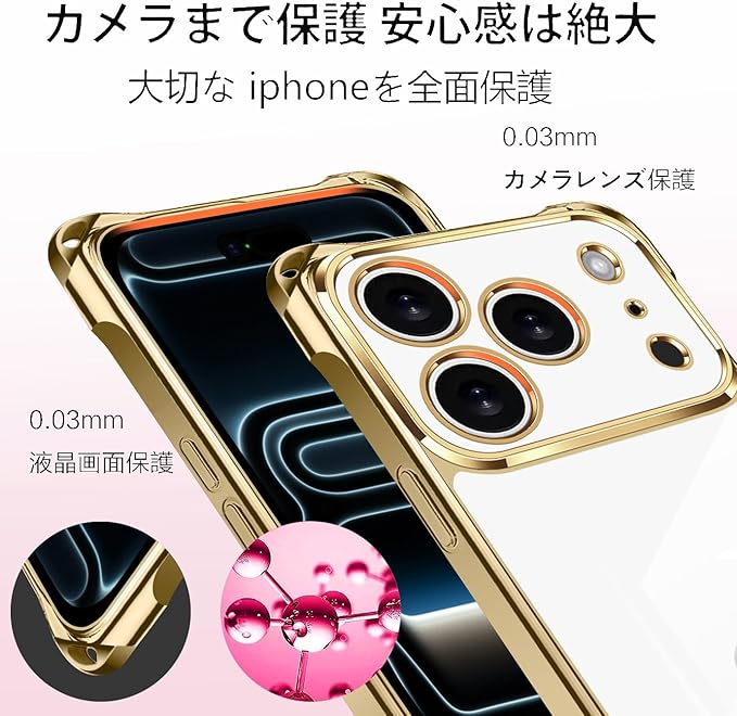 【高耐衝撃性・全面保護】カメラレンズの周りに段差をつけて擦り傷を防ぎます、平らな場所においても、液晶画面とカメラレンズに直接触れることがなく、ケース四隅のエアクッションデザインにより、ケースの四角を強化し、本体が落ちる場合に伝わる衝撃を吸収し、落下時の衝撃を最小限に抑えます、iPhoneを全方位からしっかり守れます。