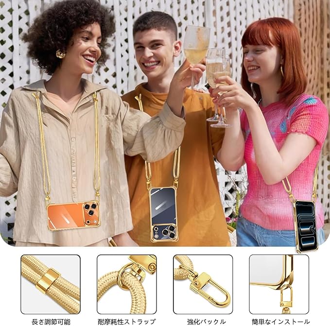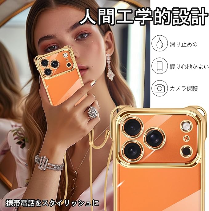 For iPhone 17 Pro Max 用 ケース クリア カバー ショルダー ネック [1枚ガラスフィルム付き] 耐衝撃 全面保護 アイフォン17promax 縄掛けケース 薄型 シリコン TPU 紐付き 斜めがけ 取り外し可能 落下防止(ゴールド)