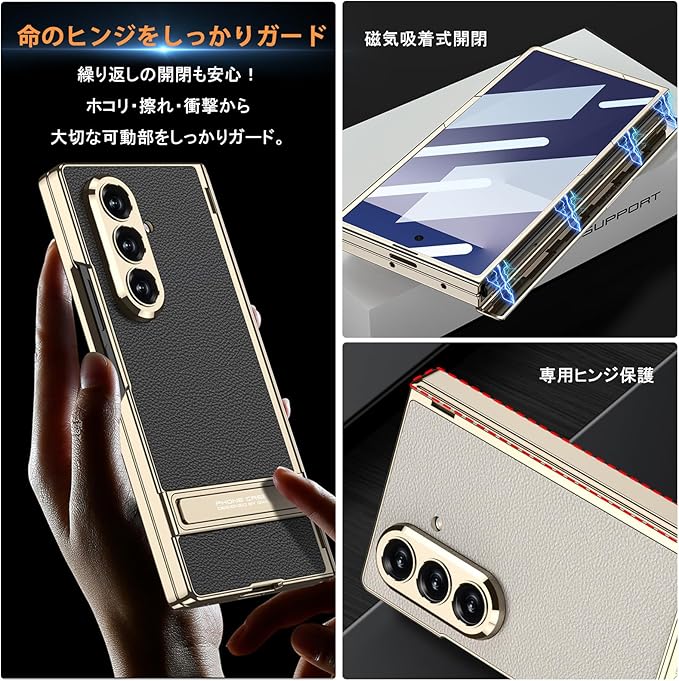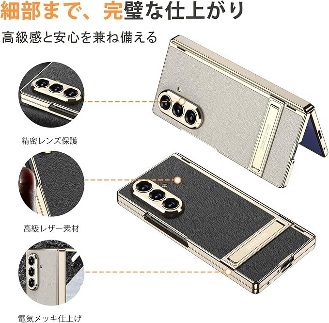 【上質レザーと光沢フレームが織りなす、洗練のデザイン】フレーム部分には繊細な光沢を放つメッキ仕上げを採用。金属のような質感がZ Fold 7本体と美しく調和し、持った瞬間に感じる“ワンランク上”の存在感。手元を上品に引き立てます。背面には、上質なレザー素材を採用しており、指紋や汚れが付きにくく、さらりとした触り心地で長時間の使用でも快適。見た目の美しさと機能性を両立した、こだわりの質感設計です。触れるたびに、その上質さを実感いただける逸品です。