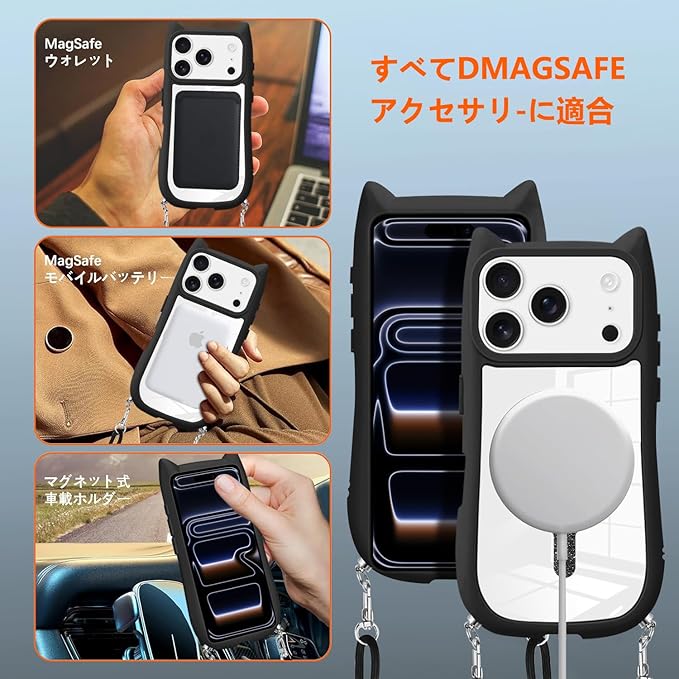 iPhone 17 ProMax ケース クリア ネコ ねこ リング マグセーフシール PC背面+ TPU ストラップ付き 肩掛けスマホケース ストラップ着脱可 いphone 17promax 携帯カバー 可愛い 人気 全面保護 耐衝撃 高質感