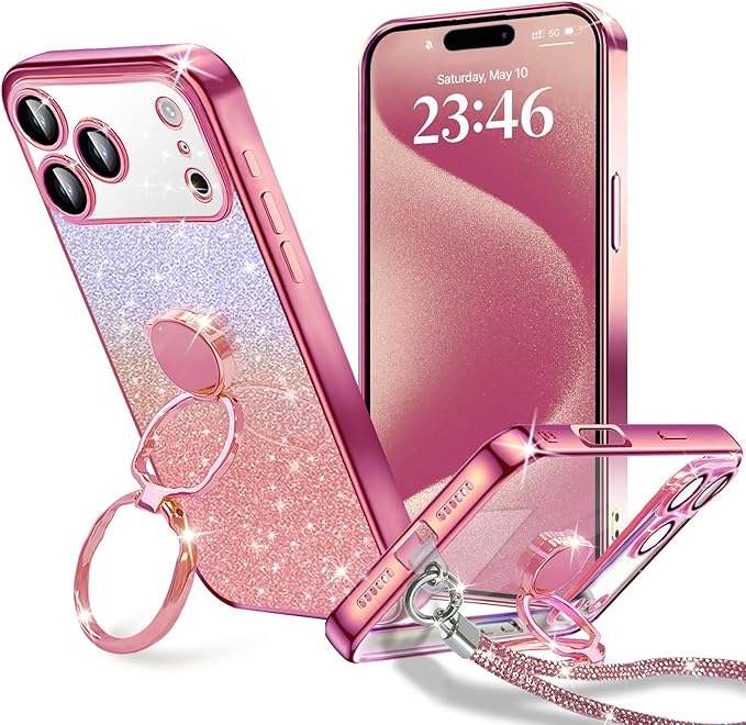 iPhone 17 Pro Max ケース ダブルリング付き グリッターカード&リストストラップ 17 Pro Max カバー 軽量薄型 キラキラ デザイン可愛い おしゃれ 女子向け レンズ保護 iphone 17 Pro Max スマホケース - ローズゴールド