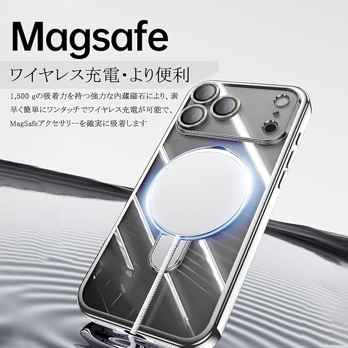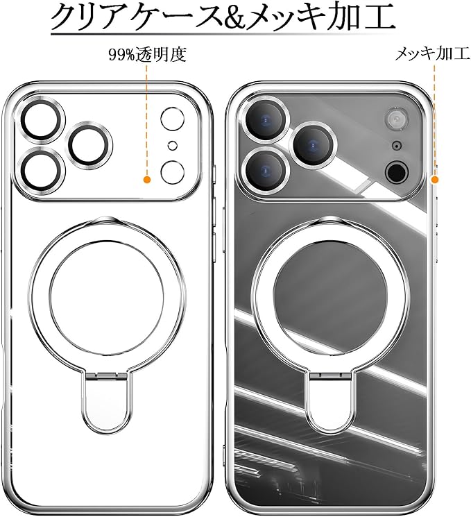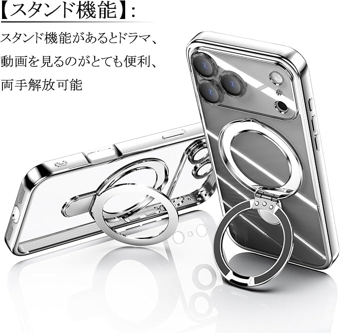 スマホケース 対応 iPhone 17 Pro Max ケース MagSafe対応 クリア 透明 リング付き メッキ仕上げ レンズカバー付き ソフトTPU 耐衝撃 傷に強い背面 ワイヤレス充電 ストラップホール付き アイフォン17プロマックス 磁気カバー (シルバー, 17Pro Max)