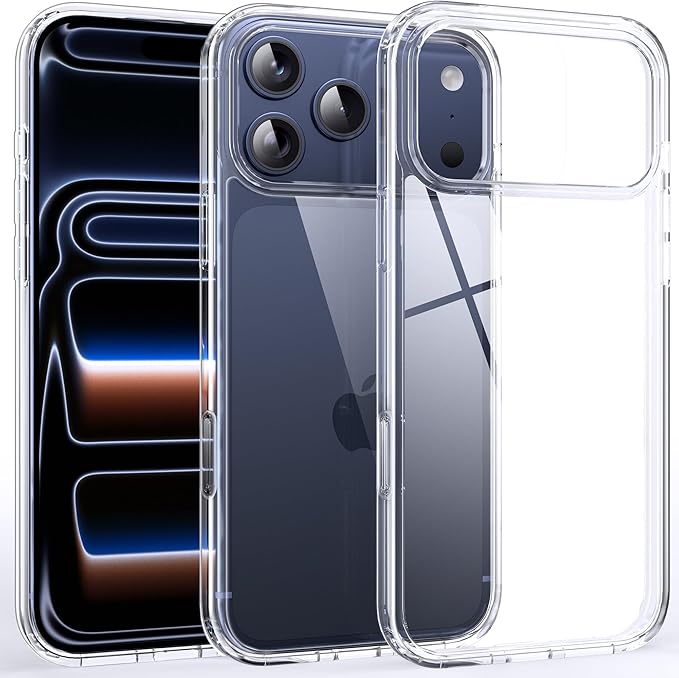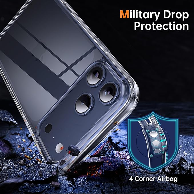 【米軍規格・SGS認証済み】Supdeal 防震透明スマートフォンケースは、iPhone 17 Pro Maxと互換性があります。このケースは、米軍のMILテストおよびSGS落下試験の認証を取得しています。突起したベゼルは、画面とカメラを跌落や傷から保護し、カメラ部分には0.8mmのベゼル、画面部分には0.2mmのベゼルがあり、絶対に信頼できる製品です。