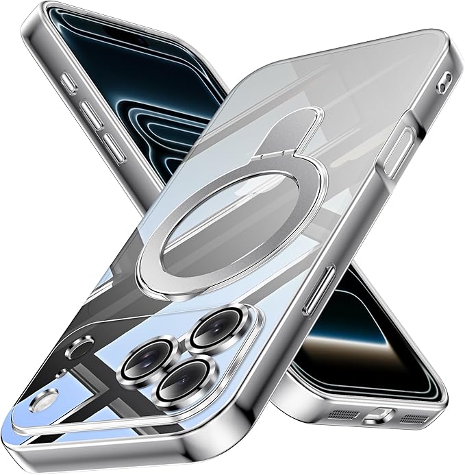 対応 iPhone 17 Pro Max 用ケース 強力マグネット スタンド機能付き 耐衝撃 magnetic 背面クリア TPU 軽量 薄型 ワイヤレス充電 米軍MIL規格 隠し収納式 多機能一体スタンド メッキ加工 スマホケース (銀) 26-ip17pm-02