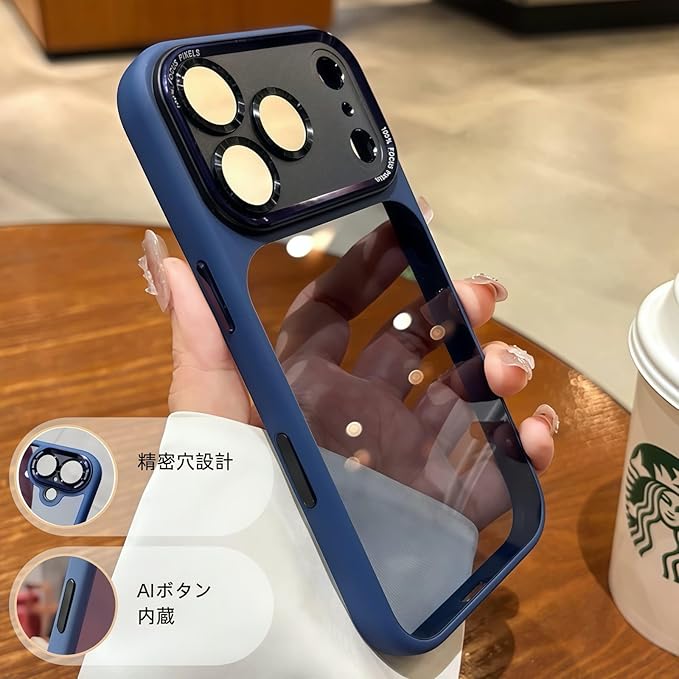 iPhone 17 Pro Max ケース、一体型カメラレンズ保護機能付き、 [ミルグレード耐衝撃防御] 透明バックプレーン保護ケース、iPhone 17 Pro Max 用、ブルー
