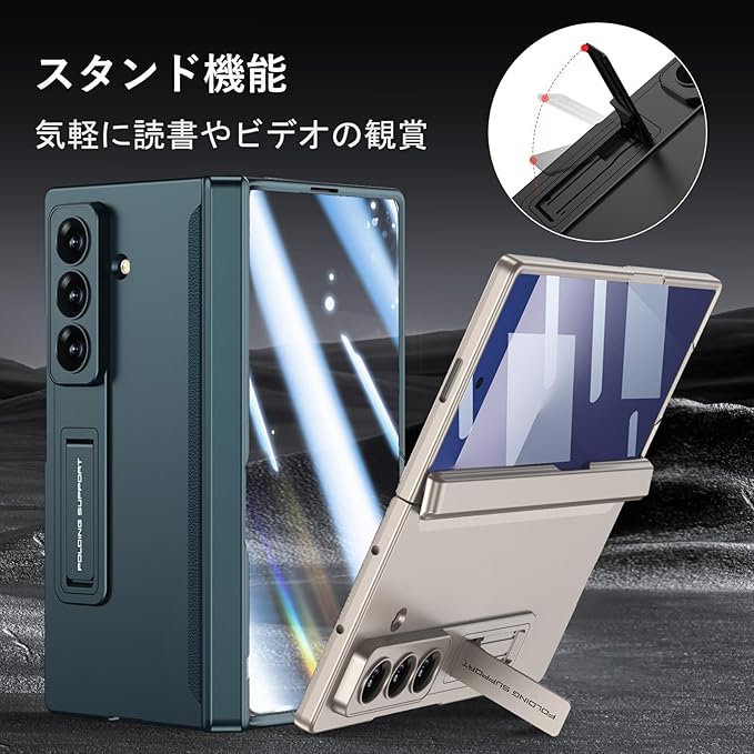 「スタンド付き」ケースの裏側に収納したスタントが付き、頑固で少し大きくデザインしており、開いた状態でスマホをしっかりホールドでき、お気楽に引き閉じれ、いつでも動画視聴を楽しむことができます。