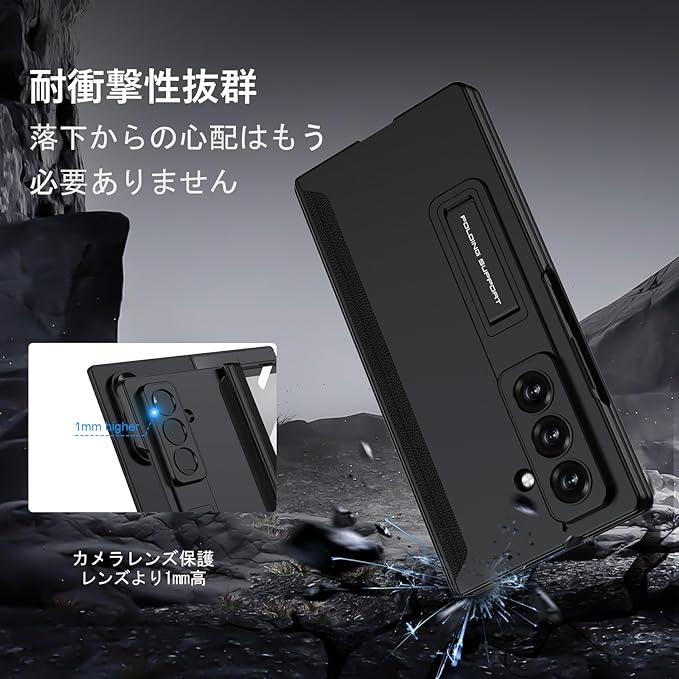 Galaxy Z Fold7 ケース ガラスフィルム付き Samsung ギャラクシーZ フォールド7 / SC-56F / SCG34 用 カバー ヒンジ保護 カメラレンズ保護 全面保護 Uovon スマホケース スタンド付き ストラップ穴付き おしゃれ 人気 薄型 軽量 耐衝撃 ・ ブラック