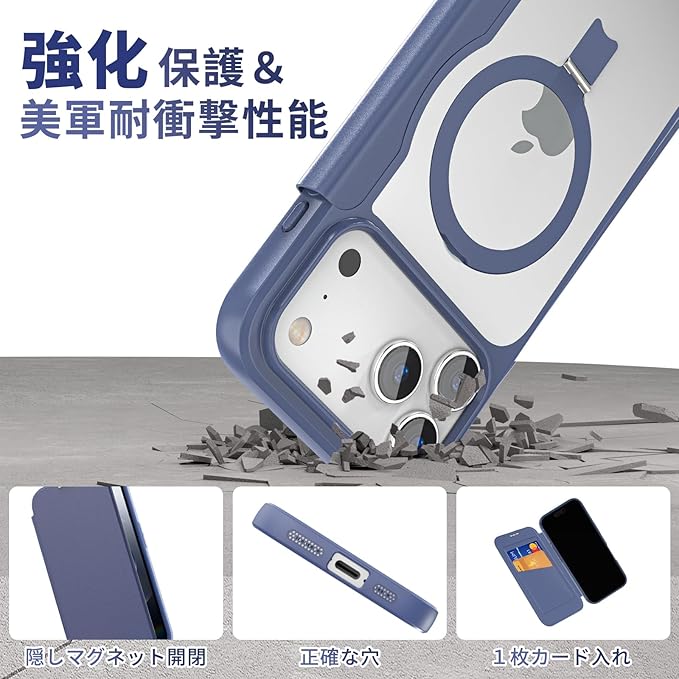 【Magsafe対応 多機能スタンド】smhokesu iPhone 17Promax用 ケース 手帳型 MagSafe対応 いphone17Promaxスマホケース リング&スタンド切り替え ワイヤレス充電対応 カード収納2枚 マグネット式 背面クリア カメラ保護カバー レザー 耐衝撃 全面保護 アイホン iPhone 17Promax用 6.9インチ用 ブルー