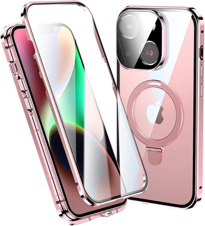 MagSafe対応 iPhone15 Plus ケース 全面カバー リング付き スタンド機能 一体型レンズ保護 マグネット式 iphone 用 15 plus カバー 両面ケース アルミバンパー 強化ガラス 透明 クリア ,ピンク