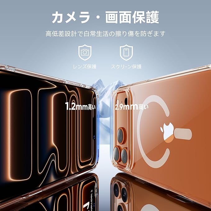 いくら気をつけていても落とす時がある!でも大丈夫!2Mの高さから26回以上落としても本体は綺麗に無傷!背面「カメラエアバッグ」耐衝撃技術も備えています。耐震性の高いTPUバンパーと頑丈なPC背面と組み合わせた二重構造で、非常に高い耐衝撃性を誇り、アイフォン17 Pro Max を全方位からしっかりと守ります。