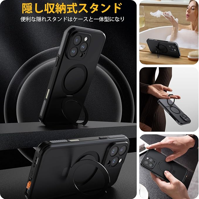 【スタンド機能・MagSafe対応】便利な隠れスタンドはケースと一体型になり、絶妙なデザインで携帯を自由に多角度を調節でき、力よくスマホを支えて、映像や読書などに楽しめることができます。強力なN52マグネットを搭載しており、マグセーフ充電器やその他様々なマグセーフマグネットアクセサリーをしっかりと保持します。また、急速充電可能です、マグセーフアクセサリーとの完全な互換性があり、安心してお使いいただけます。