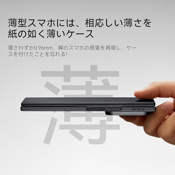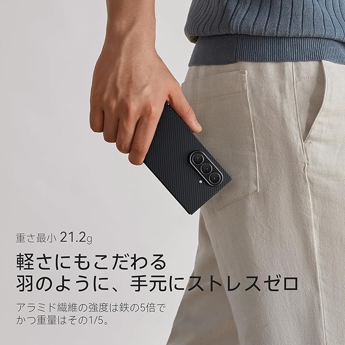 【0.96mm薄さ-ストレスフリーな使い心地】厚さわずか0.96mm、重さ約21.2gの超スリム設計。アラミド繊維は軽量でありながら高い強度を持ち、鉄のような強靭さを誇りますが、その重量はわずか四分の一程度です。長時間スマホを手にしていても手が疲れにくく、日常使いに最適。ミニマルなデザインがスマートフォンの美しさをそのまま引き立てつつ、しっかりと保護してくれます。ポケットやバッグの中でもかさばらず、快適な携帯性を実現します。