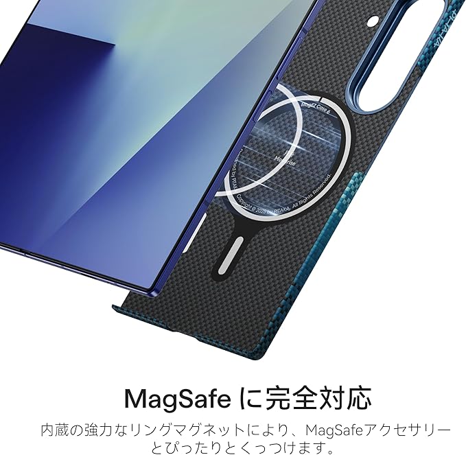 【MagSafeに対応、置くだけピッタリくっつける】超強力なマグネットが内蔵され、MagSafeにぴったり対応。Galaxy Z Fold 7本体をMagSafeアクセサリー接続で便利にお使いいただけます。またPITAKAのスマホリングMagEZ Grip3や、NFC対応Qi2.0車載充電器MagEZ Car Muont Pro2 Qi2に最適です。